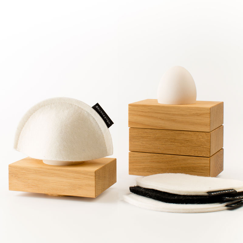 Vier stapelbare Eierbecher gefertigt in solider Eiche. Im Lieferumfang befinden sich vier Filzkappen, drei weiße und eine schwarze. Wer zuletzt zum Frühstück erscheint, bekommt die schwarze und muss den Tisch abräumen...