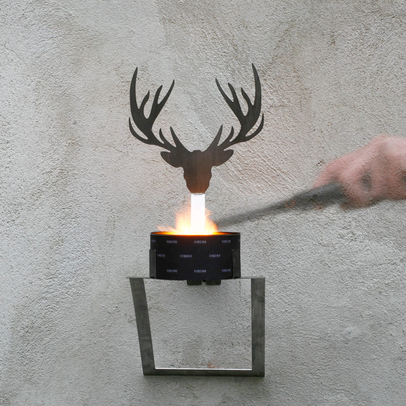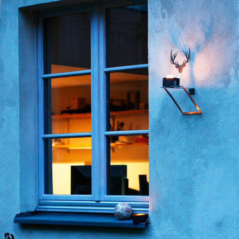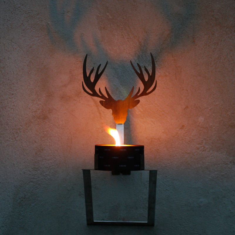 Der Wandleuchter aus Edelstahl für den Außenbereich. Den beiliegenden Dübel in die Wand bringen, Schraube eindrehen, den Edelstahlleuchter aufbiegen und auf die Schraube stecken. Die Dosenkerze einklemmen und anzünden. 4 – 5 Stunden wird der Schatten des Motives nun Freude bereiten.